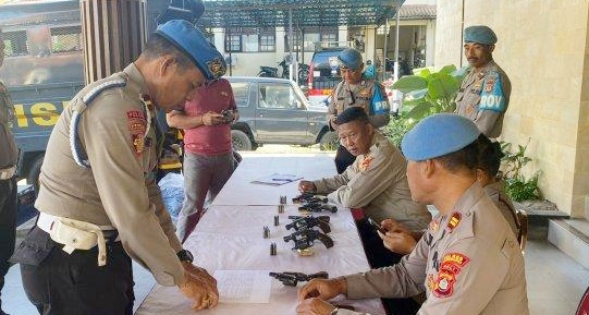 Propam Polres Klungkung melakukan pemeriksaan terhadap senjata api dinas yang dipegang oleh anggota kepolisian di Klungkung, Kamis (28/3/2024). (foto:istimewa)