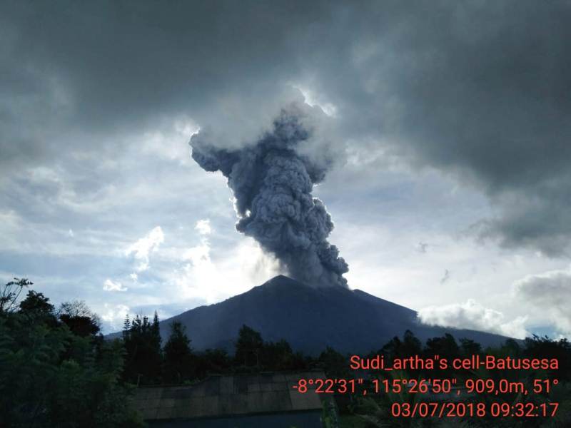 Karangasem, suarabali.com – Hingga Selasa (3/7/2018) sekitar pukul 09.28 WITA, Gunung Agung masih erupsi dengan kolom abu setinggi 2.000 meter di atas puncak kawah yang condong mengarah ke barat.