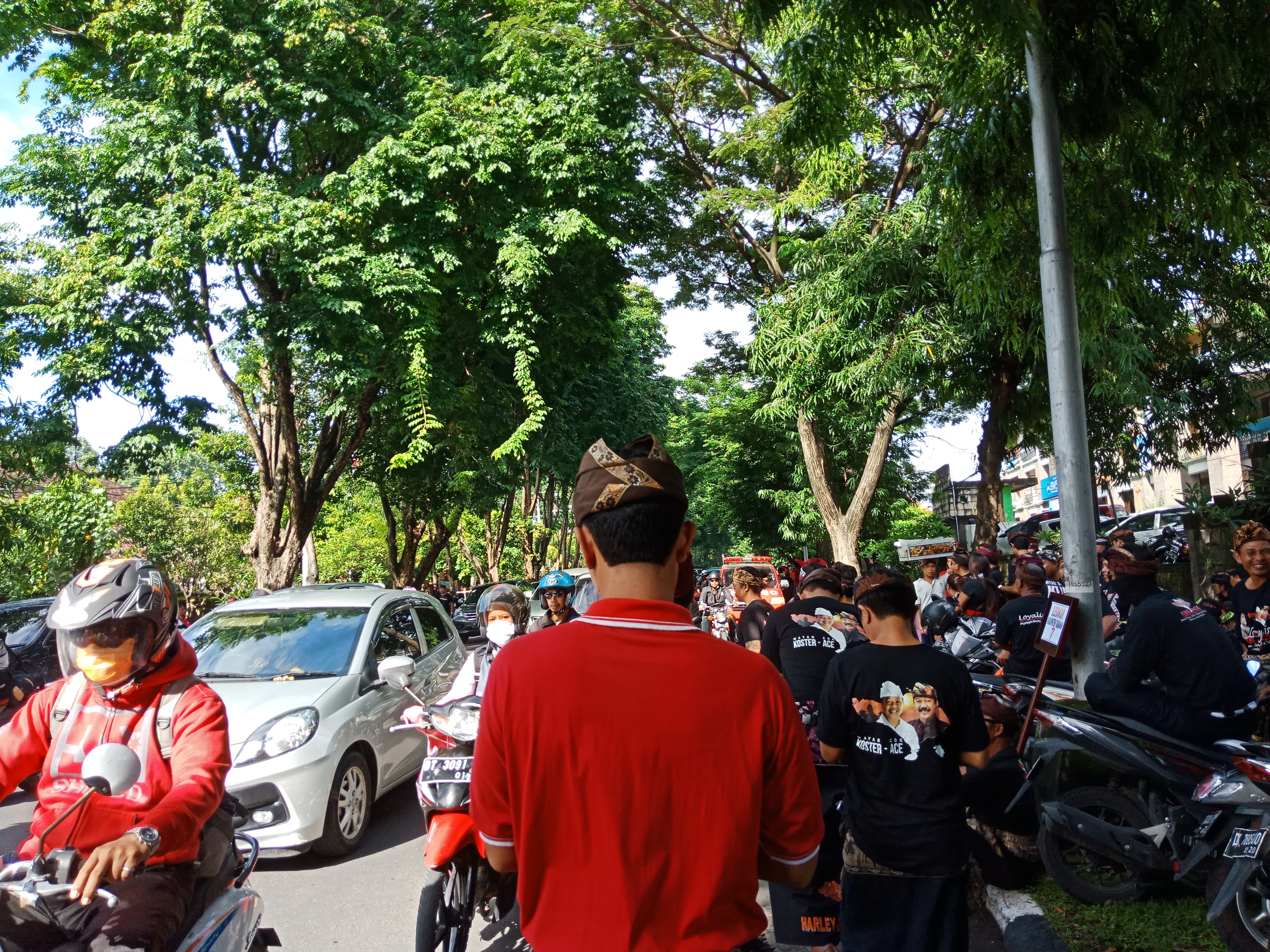Saat ini di pinggir jalan tersebut dipenuhi pendung berpakaian warna merah. Selain itu, juga ada beberapa kader yang memainkan musik tradisional Bali Bale Ganjur.