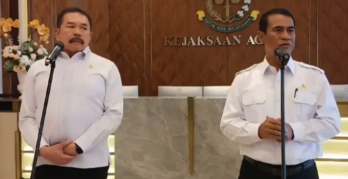 Jaksa Agung Sanitiar (ST) Burhanuddin dan Menteri Pertanian (Mentan) Andi Amran Sulaiman memberikan keterangan dengan awak media di Gedung Kejaksaan Agung, Jakarta, Senin (16/12/2024).