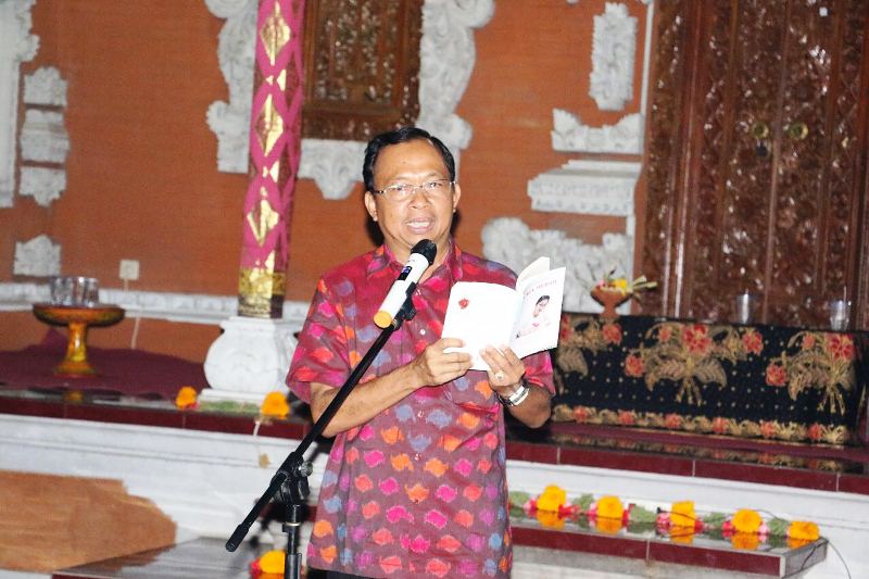 Bahkan, Koster juga mampu menghibur warga dengan membacakan puisi karya sang istri tercinta yang merupakan seniman perempuan Bali kenamaan. Judul puisi yang dibacakan Koster “Kutitipkan Satu Hati”.