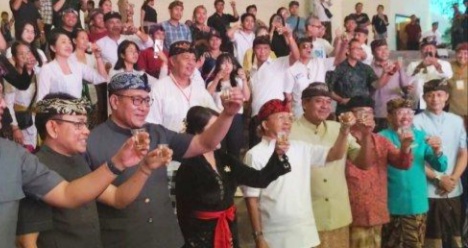 Gubernur Bali terpilih Wayan Koster bersama hadirin melakukan tos arak Bali menandai perayaan Hari Arak Bali ke-3 pada Rabu 29 Januari 2025 di GWK, Badung, Bali.