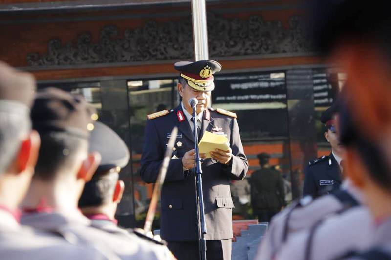 Denpasar, suarabali.com – Wakapolda Bali Brigjen Pol. I Wayan Sunartha memimpin upacara memperingati Hari Lahir Pancasila di halaman depan Mapolda Bali, Denpasar, Jumat (1/6/2018). Upacara ini diikuti ribuan personel Polda Bali.